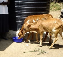Fröhlicher Gesang und rhythmisches Klatschen schallen uns entgegen, als wir in Barut, einem Dorf etwas außerhalb von Nakuru aus dem Auto steigen. Die Frauen der Projektgruppe Ker-tai empfangen uns mit strahlenden Gesichtern und geleiten uns mit wiegenden Tanzschritten auf das Grundstück einer der 20 Familien, die seit einigen Wochen stolze Besitzer eines Wassertanks sind. Gläser und eine bunte Kanne stehen schon bereit, und sogleich wird uns demonstriert, wie aus dem Zapfhahn unten am Tank frisches, klares Wasser fließt. Dieses Zeremoniell wiederholt sich noch einige Male: An jedem Haus mit neuem Tank werden wir freudestrahlend begrüßt und genötigt, den Zapfhahn zu öffnen, um anschließend einem der Anwesenden ein gefülltes Glas zu reichen. Sogar zwei Kälbchen werden durch das leise Plätschern angelockt. Vorsichtig senken sie ihre Mäulchen in die blaue Plastikschüssel und genießen die unverhoffte Erfrischung.